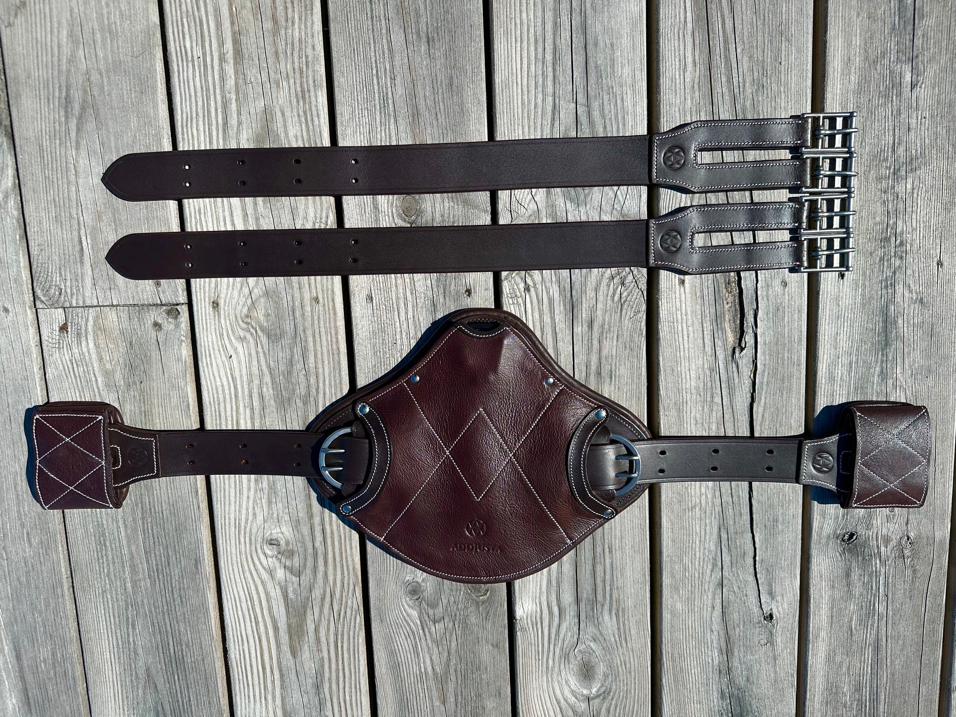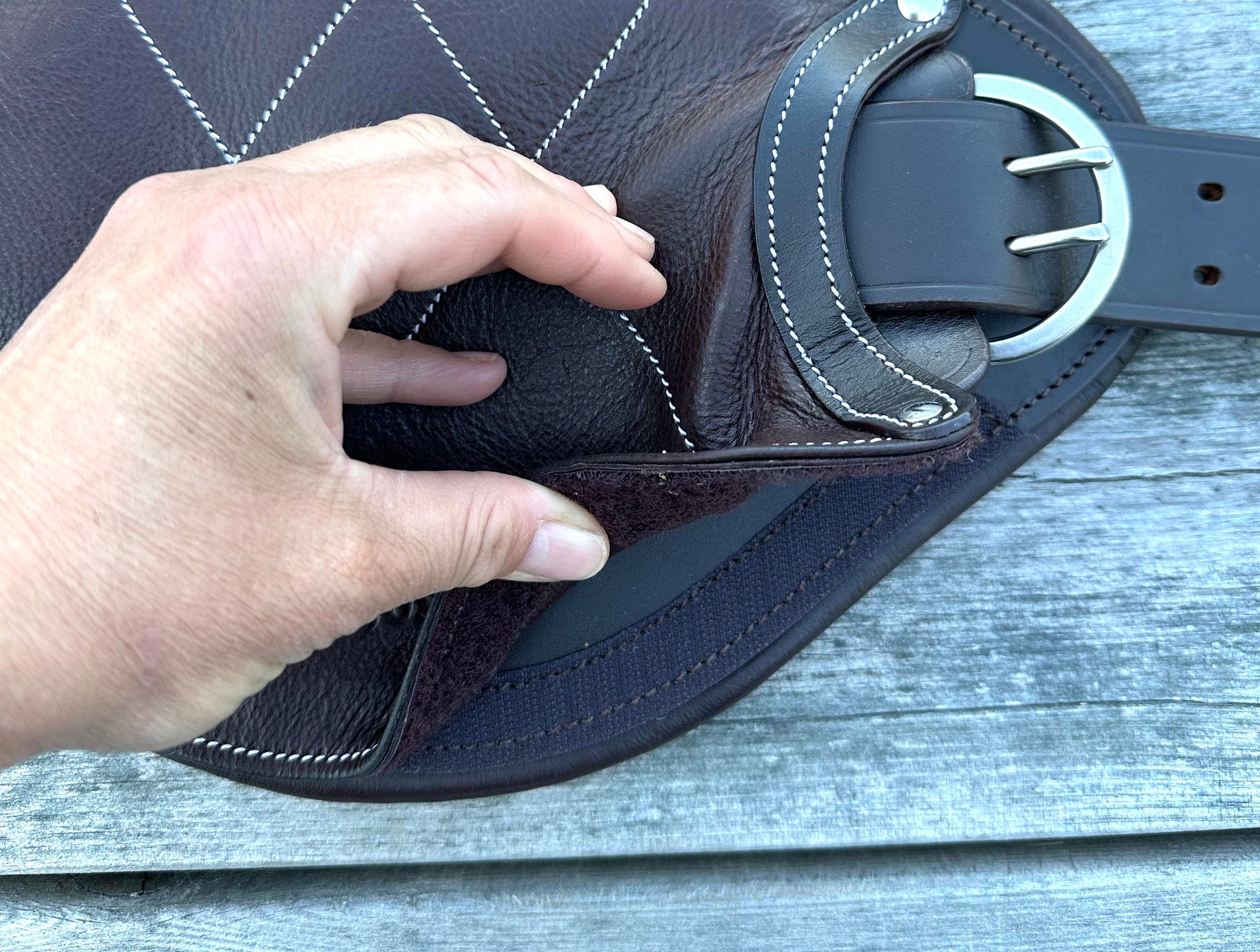 The unique construction of the girth allows the horse to move freely with shoulder freedom. By easily adjusting the length you make sure the buckles of the short straps are not interfering with the shoulder movement. We recommend adjusting the length of the girth straps so that the buckles will be as close to the bottom of the saddle flaps as possible.